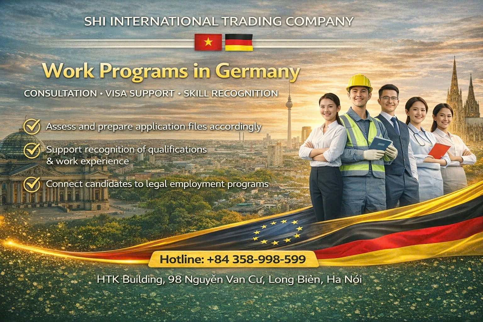 Công ty TNHH Thương mại Quốc tế SHI là đơn vị tư vấn, đào tạo và kết nối nhân lực quốc tế uy tín tại Việt Nam. Chúng tôi hoạt động với phương châm “Uy tín tạo nên thành công”, cam kết cung cấp các giải pháp minh bạch, bền vững và phù hợp, đáp ứng nhu cầu của người lao động, học viên và các đối tác quốc tế.
