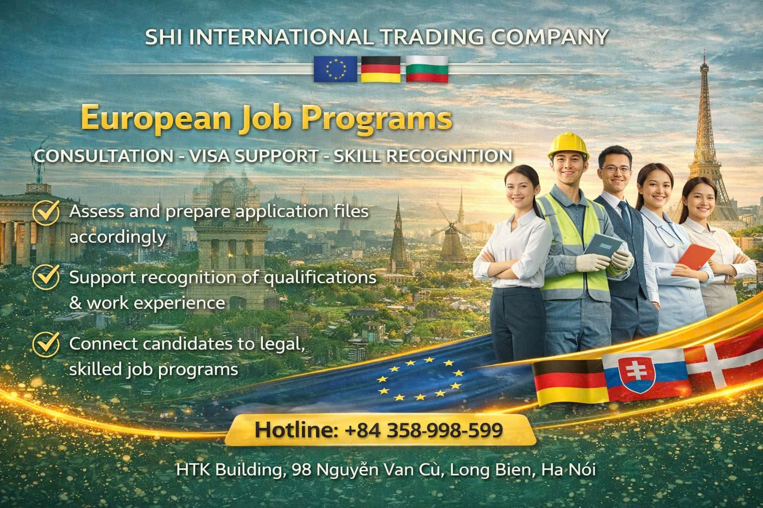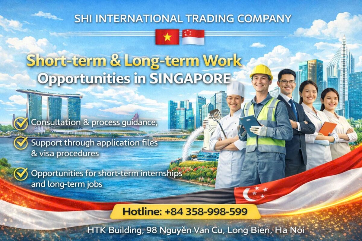 Công ty TNHH Thương mại Quốc tế SHI là đơn vị tư vấn, đào tạo và kết nối nhân lực quốc tế uy tín tại Việt Nam. Chúng tôi hoạt động với phương châm “Uy tín tạo nên thành công”, cam kết cung cấp các giải pháp minh bạch, bền vững và phù hợp, đáp ứng nhu cầu của người lao động, học viên và các đối tác quốc tế.